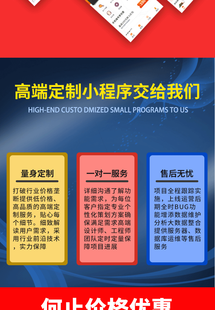 1.我们可为您提供模版/定制开发/行业解决方案/营销推广等服务,您在此下单的费用属于制作与后续维护升级费用,因小程序制作涉及内容太多,不含增值服务,如需定制开发,代运营,营销推广,可与销售沟通。