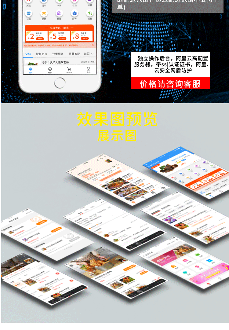 8、系统设置1)基本信息:平台名称、平台电话、平台风格、颜色、平台模式(多店版 单店版)、默认门店、门店介绍2)支付配置:自动收货、积分开启、积分比例3)帮助中心:设置常见问题以及答案4)模板消息:外卖通知、当面付订单通知、预约订单通知